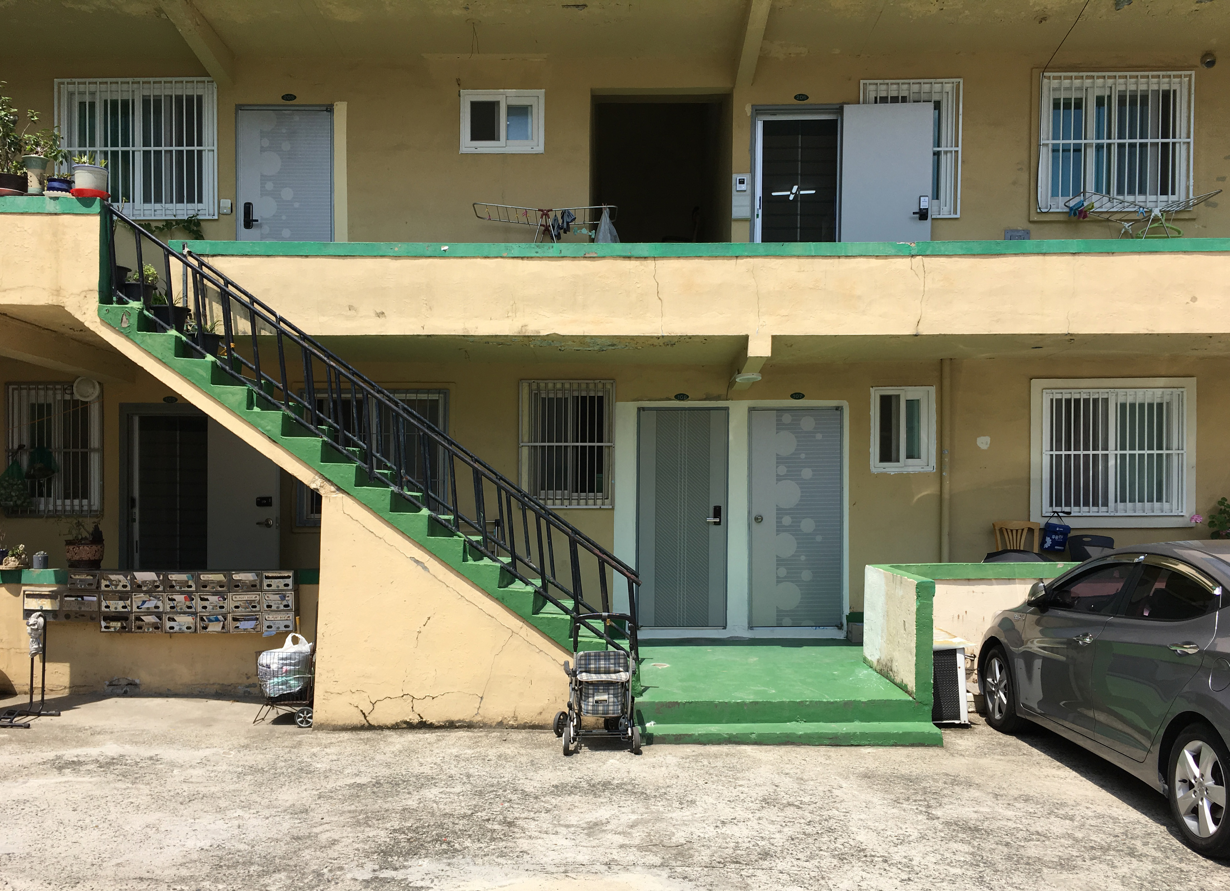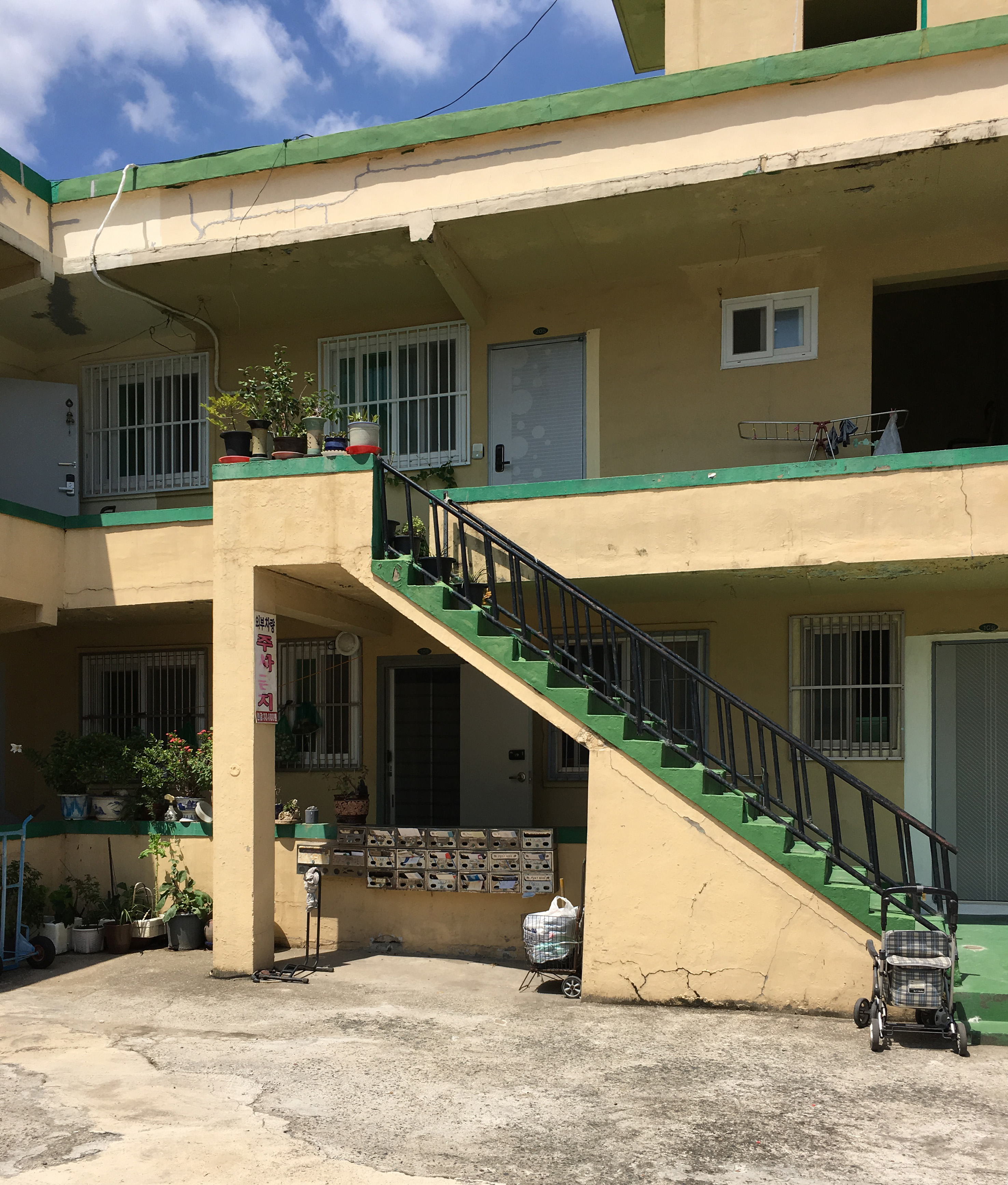 | 1층 복도 주변으로도 나즈막한 담장 또는 난간을 둘렀다. 계단 하부 담장에 우편함을 설치해 사용하고 있다. |