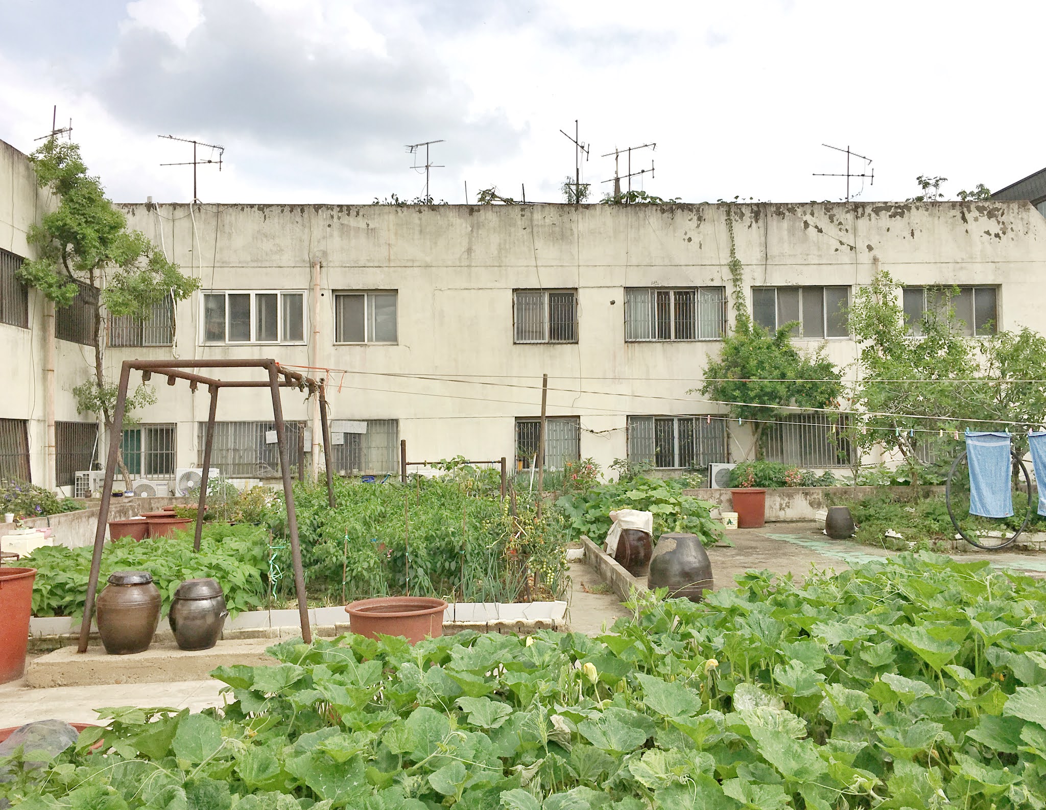 | 나동의 후면 데크. 호박, 파, 고추등을 키우고 있는 텃밭과 몇 그루의 나무가 보인다. |