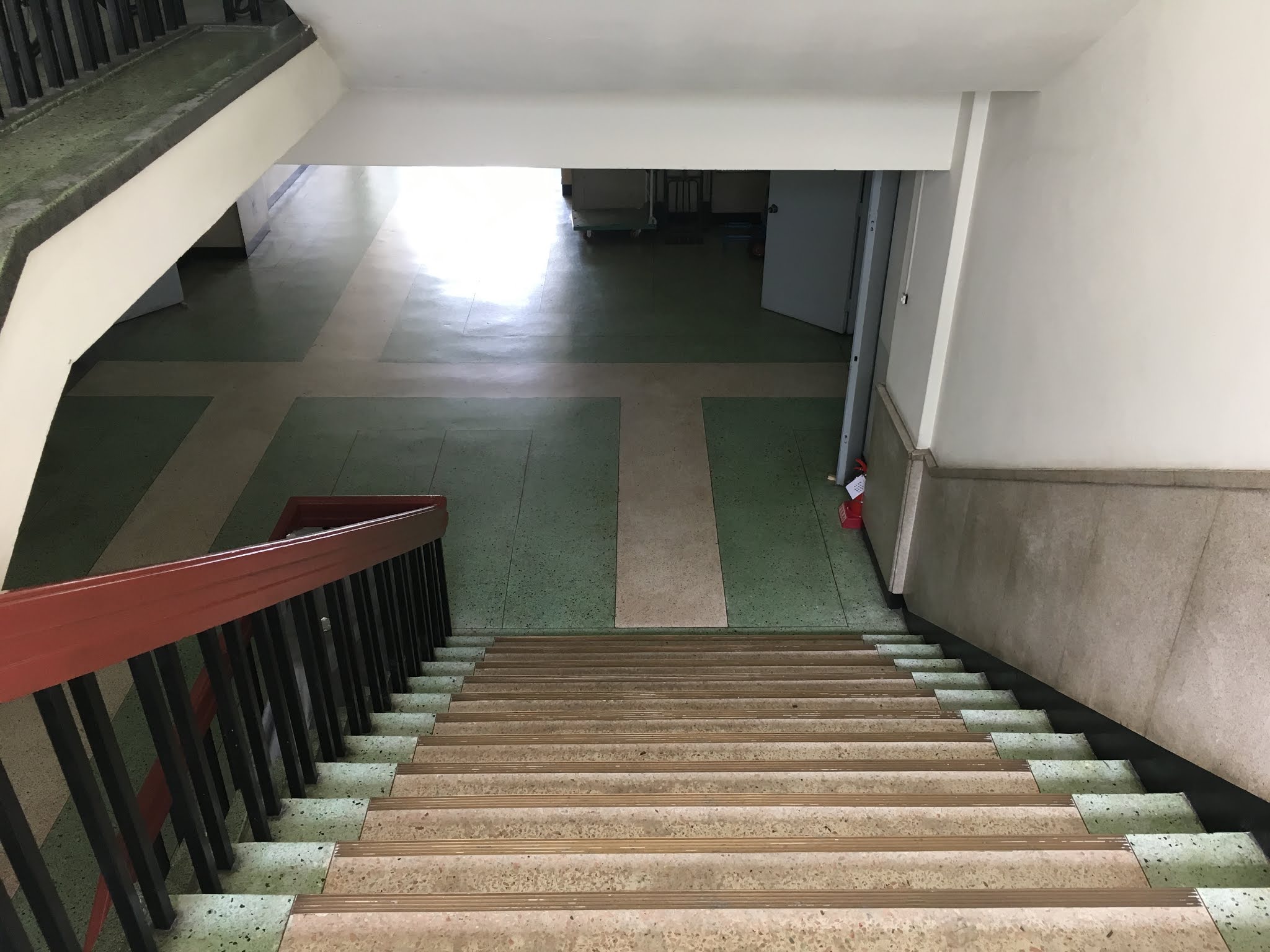 | 계단실 및 홀의 끝으로 건물 후면의 편복도가 보인다. 5층부터 편복도식으로 평면이 변경된다. |